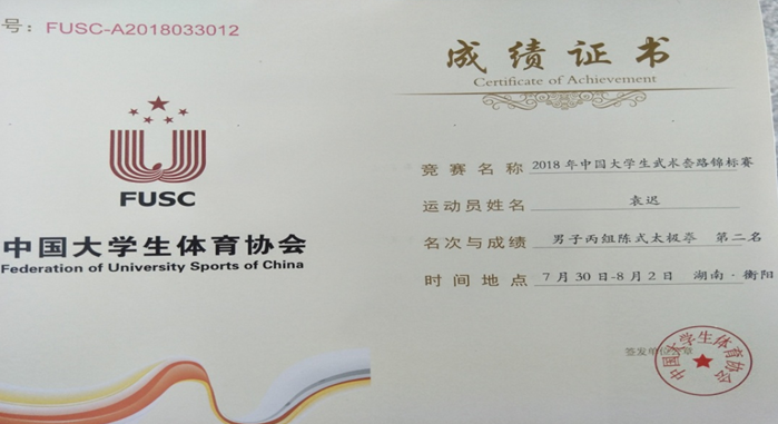 获男子丙组陈氏太极拳第二名、优秀运动员称号