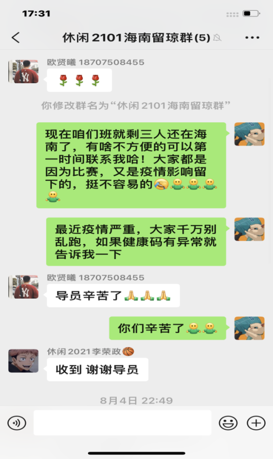 这个假期我们的辅导员老师也是一刻不停歇,一边关心学生的疫情防控,一边准备学生各种材料信息的准备工作。在疫情防控时期更是一一排查关心每一位同学的情况,悉心疏导居家不能外出同学的情绪状态。
