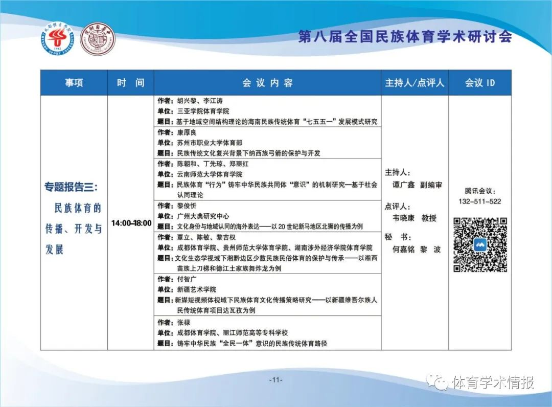 我院胡兴黎和李江涛老师共同撰写的论文《基于地域空间结构理论的海南民族传统体育“七五五一”发展模式研究》入选专题报告论文,并在线上做专题报告。李江涛老师在研讨会上从“概念阐述、‘七五五一’发展模式目标、现实条件与实践基础、‘七五五一’发展模式构建、‘七五五一’发展模式的策略应对”等分享了研究成果。中央民族大学体育学院二级教授、博士生导师韦晓康教授,华南师范大学体育科学学院副编审、《体育学刊》责任编辑谭广鑫副编审进行了精彩点评。