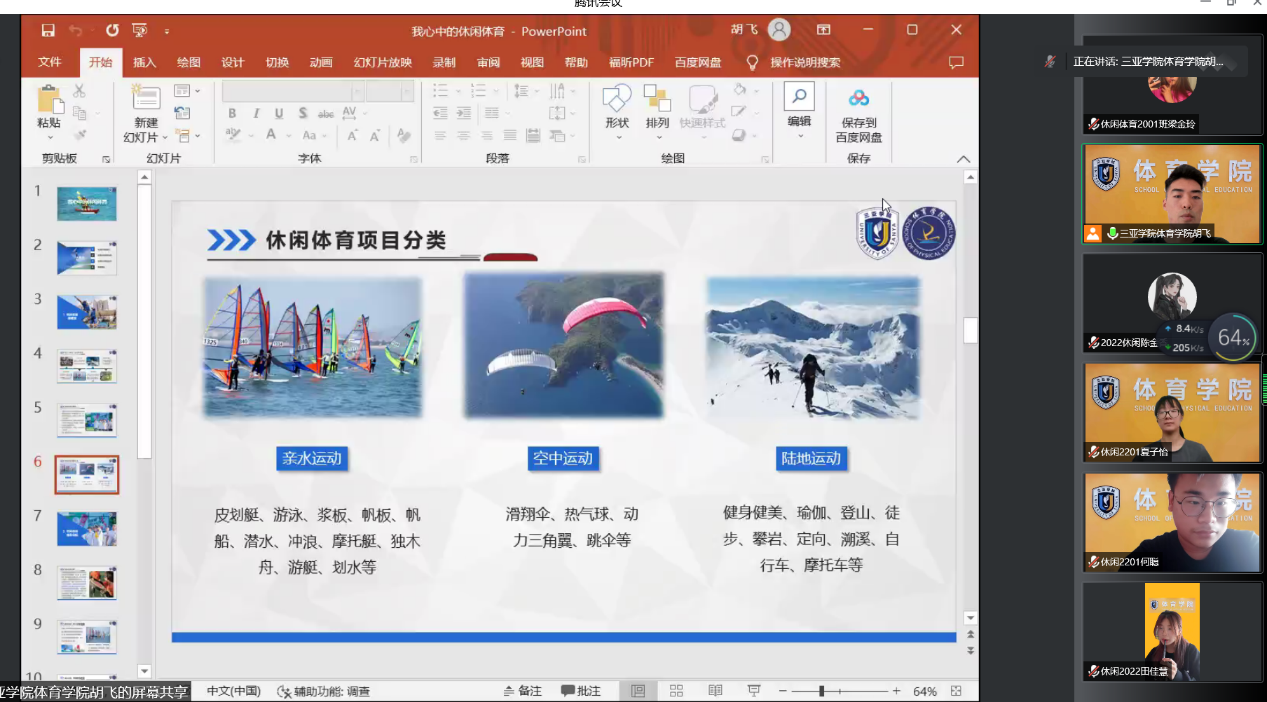为了让学生更加全面地了解休闲体育专业,对未来学习生涯有较为清晰的规划。9月26日,我院组织2022级休闲体育新生“我心中的休闲体育”专题分享活动。本次专题分享由我院体育系主任葛耀副教授主持,体育学院胡飞老师、2020级休闲体育健身方向学生梁金玲、2020级休闲体育水上运动方向魏少钜及2022级全体休闲体育专业同学参加。