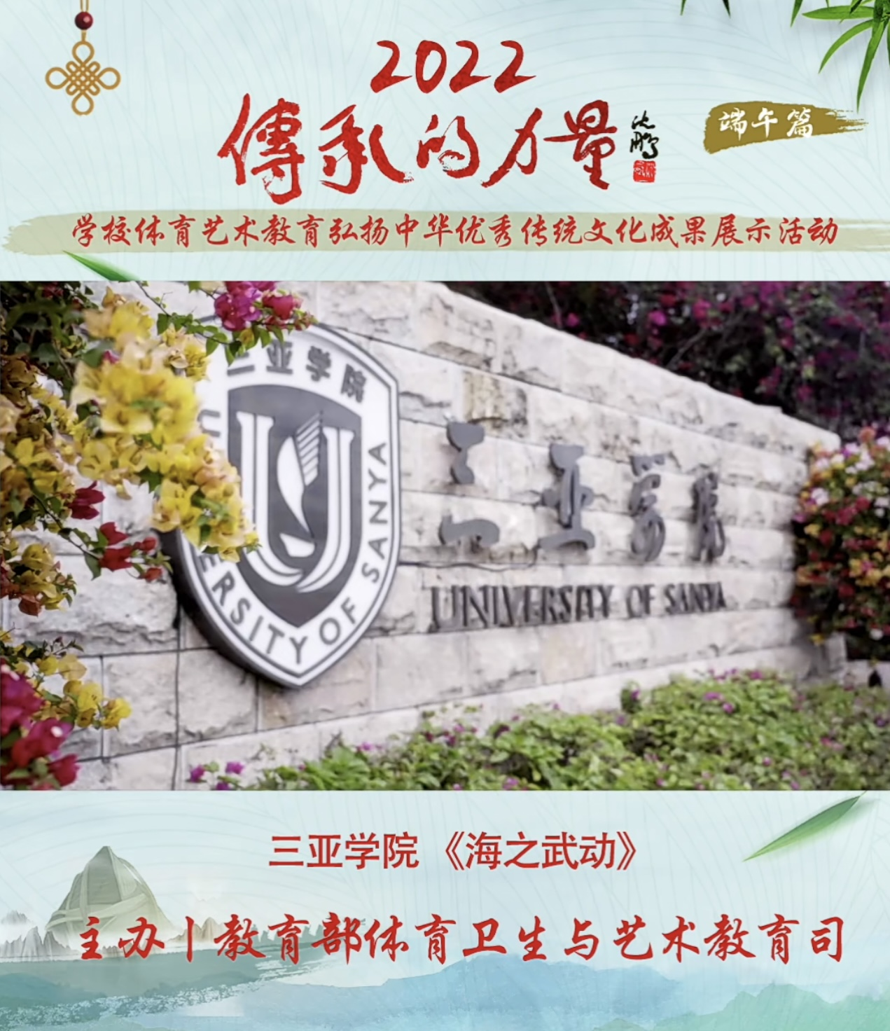 为深入贯彻落实中共中央办公厅、国务院办公厅印发的《关于实施中华优秀传统文化传承发展工程的意见》,深入开展“我们的节日”主题活动,实施中国传统节日振兴工程,把优秀传统文化教育融入国民教育全过程,教育部开展第五届《传承的力量》学校体育艺术教育弘扬中华优秀传统文化成果展示活动。三亚学院体育学院积极推送武术与民族传统体育专业宣传片《海之武韵》。