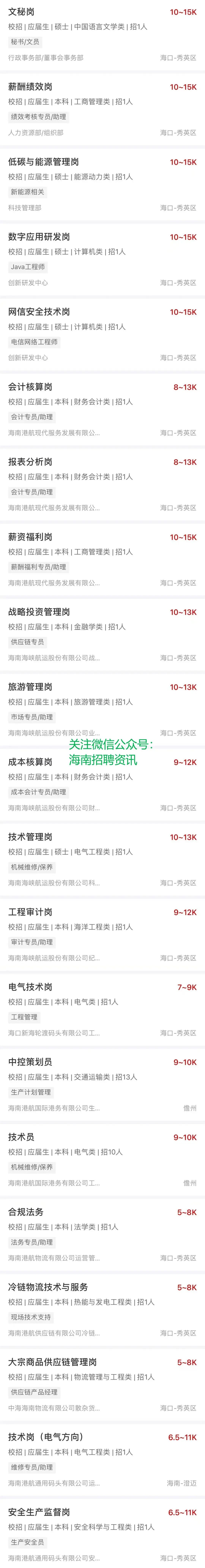 海南港航控股有限公司于2019年11月27日正式纳入中国远洋海运集团有限公司管理体系,按照中远海运集团直属二级企业管理,是海南省最大的国有港航企业。下辖5家直属单位,控股子公司海南海峡航运股份有限公司是琼州海峡客滚运输龙头企业(股票代码:002320) 一、招聘岗位 海南港航控股有限公司2023年招聘工作人员公告 海南港航控股有限公司于2019年11月27日正式纳入中国远洋海运集团有限公司管理体系,按照中远海运集团直属二级企业管理,是海南省最大的国有港航企业。下辖5家直属单位,控股子公司海南海峡航运股份有限公司是琼州海峡客滚运输龙头企业(股票代码:002320) 一、招聘岗位