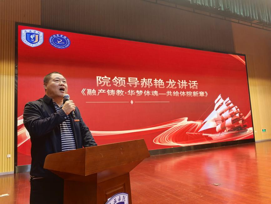随后,院领导郝艳龙发表了题为《融产铸教,华梦体魂——共绘体院新篇章》的讲话。郝院长指出,过去的一年是体育学院不平凡的一年。师生们不仅积极参与了第12届全国少数民族运动会,还在各项服务与竞赛中展现了出色的专业素养,同时还担任了各类大型活动赛事的裁判工作。这些都是体育学院产教融合所取得的显著成果,也为提升科研等个人能力提供了宝贵的实践机会。