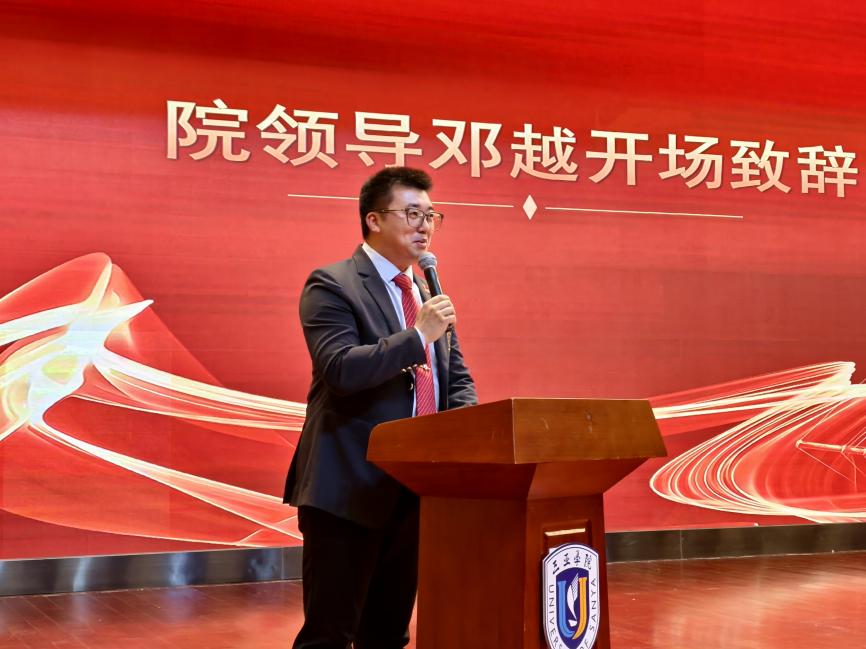 紧接着,体育学院院领导邓越发表了致辞。他对体育学院教职工在产教融合道路上所做出的默默奉献表示认同和肯定。他总结了体育学院产教融合所取得的成果,并鼓励大家在未来的道路上继续砥砺前行,共同书写体育学院更加辉煌的篇章。