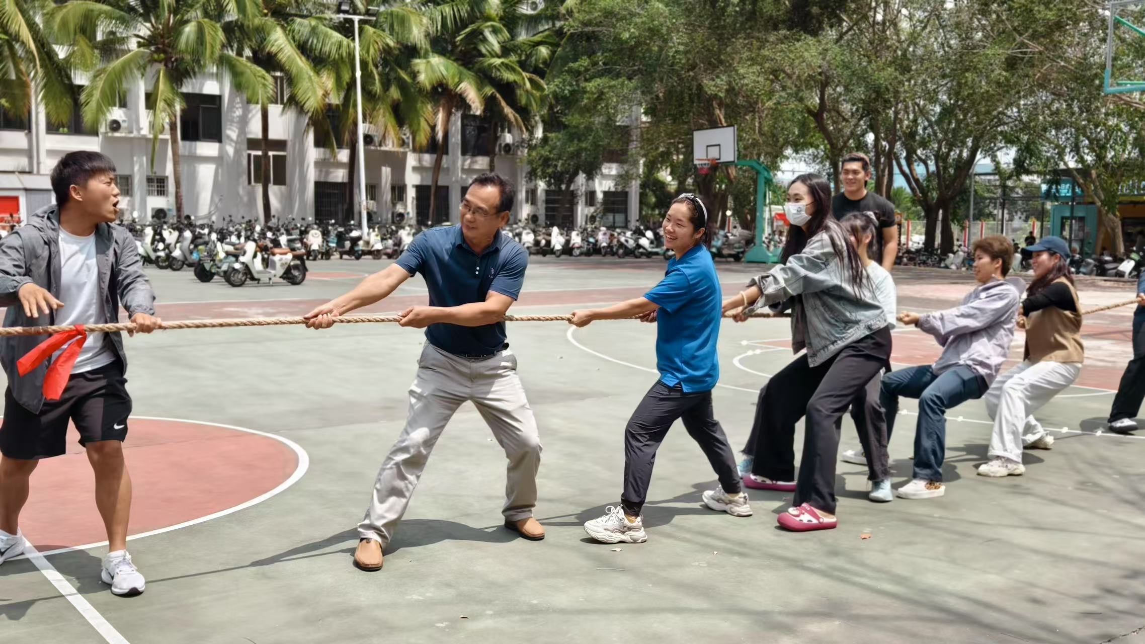 随后,拔河比赛把活动推向了高潮。由老师们和同学们组成的队伍,与十名同学组成的另一队展开激烈对决。赛前,老师反复强调“安全第一、比赛第二”的原则,让同学们在享受比赛乐趣的同时,也要时刻注意自身安全。随着一声响亮的哨声,双方队员紧紧握住绳子,齐心协力向后拉。每个队员都涨红了脸,卯足了劲,双脚如同生了根一般稳稳扎在地上。一旁的啦啦队也毫不逊色,他们挥舞着手中的旗帜,有节奏地呼喊着口号,为参赛队员们加油助威。