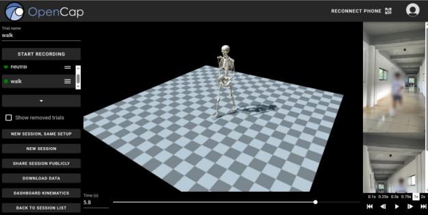 实验现场,学生在教师指导下快速搭建了采集系统:两台iOS设备、三脚架及校准棋盘配合使用,单人数据采集设置全程不足五分钟。OpenCap系统通过云端人工智能实时解析,生成了关节角度、关节负荷与肌肉激活等关键生物力学参数。这种将复杂生物力学分析转化为易操作教学活动的设计,使不同专业背景的学生都能直观理解技术核心。同时,OpenCap也一定程度上提高了运动损伤风险评估的高效性与精准性,为相关人员在青少年脊柱健康筛查、老年人平衡能力评估以及慢性病患者运动处方制定等方面提供辅助。