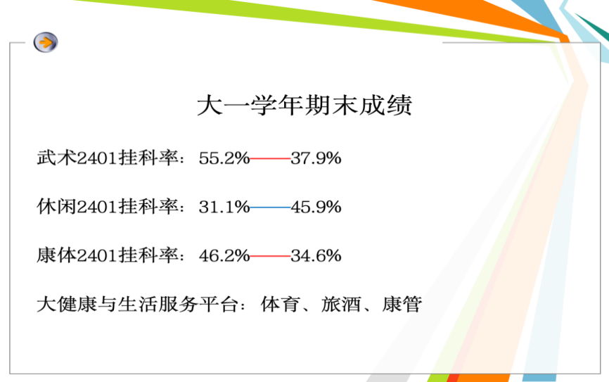 班会伊始,李茜莉老师系统梳理了大一学年期末成绩的整体情况。数据显示,各专业班级在学业表现上呈现差异化趋势:武术2401班挂科率从55.2%降至37.9%,进步显著;康体2401班也从46.2%降至34.6%,持续向好;值得关注的是,休闲2401班挂科率从31.1%升至45.9%,需在后续教学中予以重点介入与帮扶。此外,李茜莉老师还介绍了“大健康与生活服务平台”,并着重强调了体育、旅酒、康管等学科的交叉融合,为学生拓宽职业视野、规划未来发展路径提供了清晰指引。