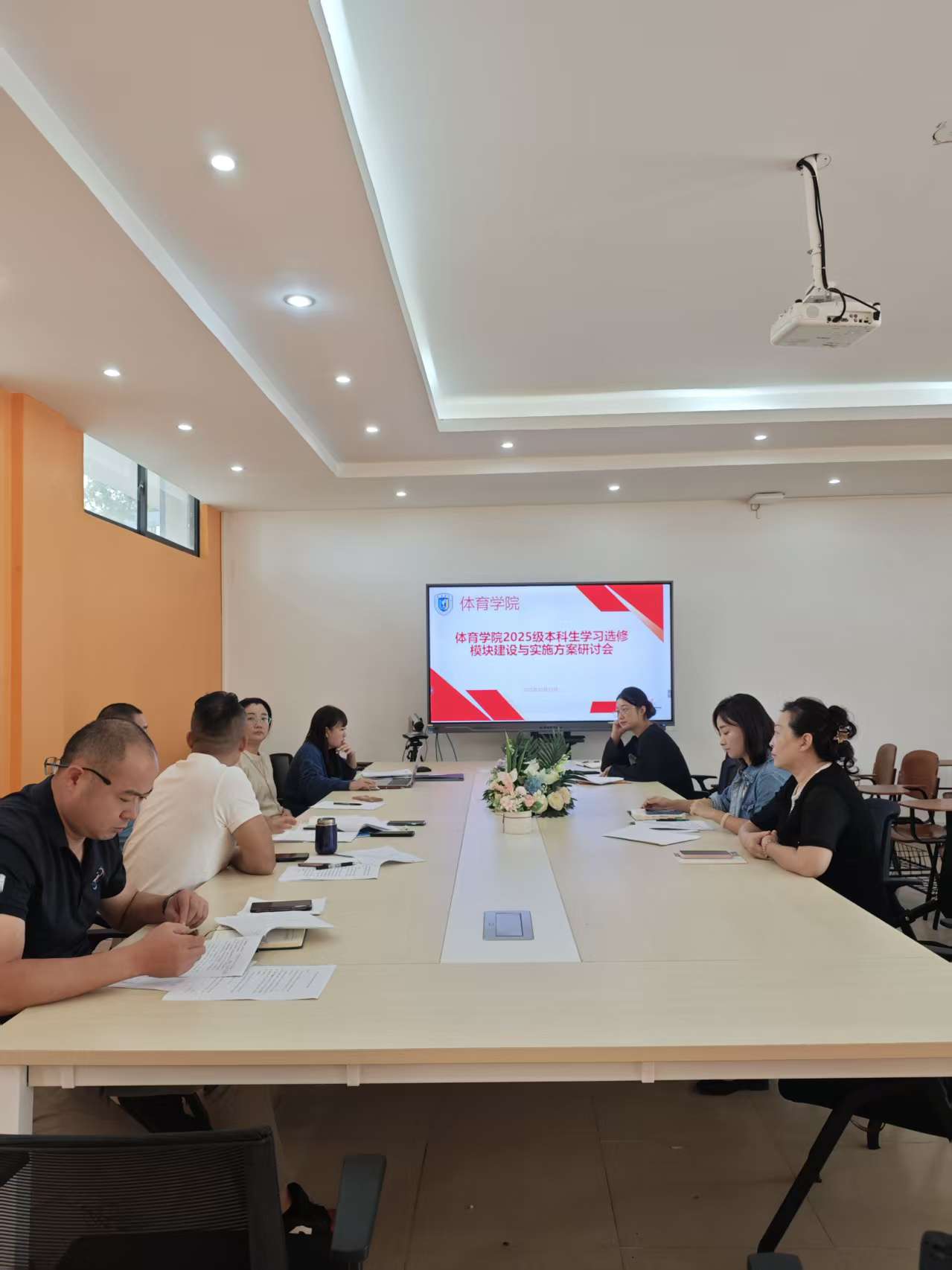 2025年10月11日,在体育学院会议室召开了本科生学习课程选修模块建设与实施工作方案专题会议,学院领导班子和教学指导委员会委员参加了会议,院领导王欣对方案进行深度解读,各专业负责人围绕方案内容展开热烈讨论,共同为优化本科生选择课程体系、提升人才培养质量谋篇布局。