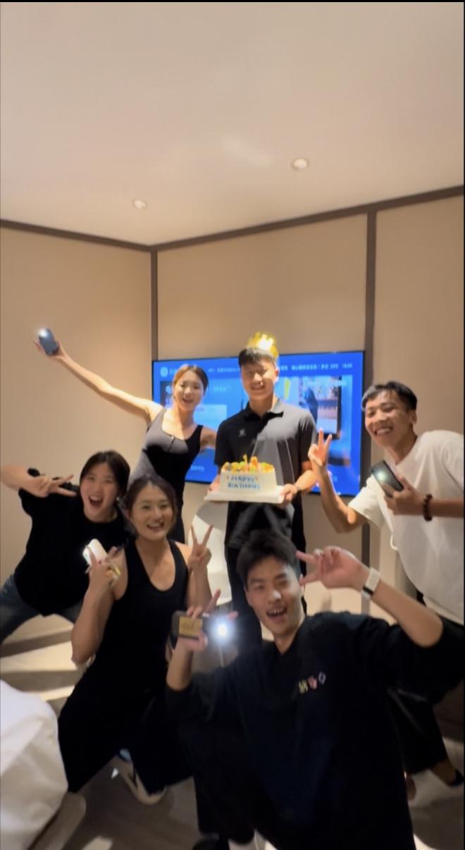 在紧张的赛程之中,队伍迎来了一段温馨而难忘的插曲。抵达比赛地后,恰逢队员休闲体育2024级吴光政同学的十九岁生日。主教练杨旭老师在临行前就已留意到这一日期,她带领全队在一天的训练结束后,悄悄准备了一场充满惊喜的生日庆祝。当蜡烛点亮、掌声响起的那一刻,赛前的紧张氛围被温情融化。