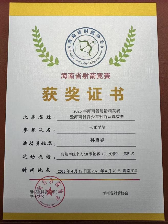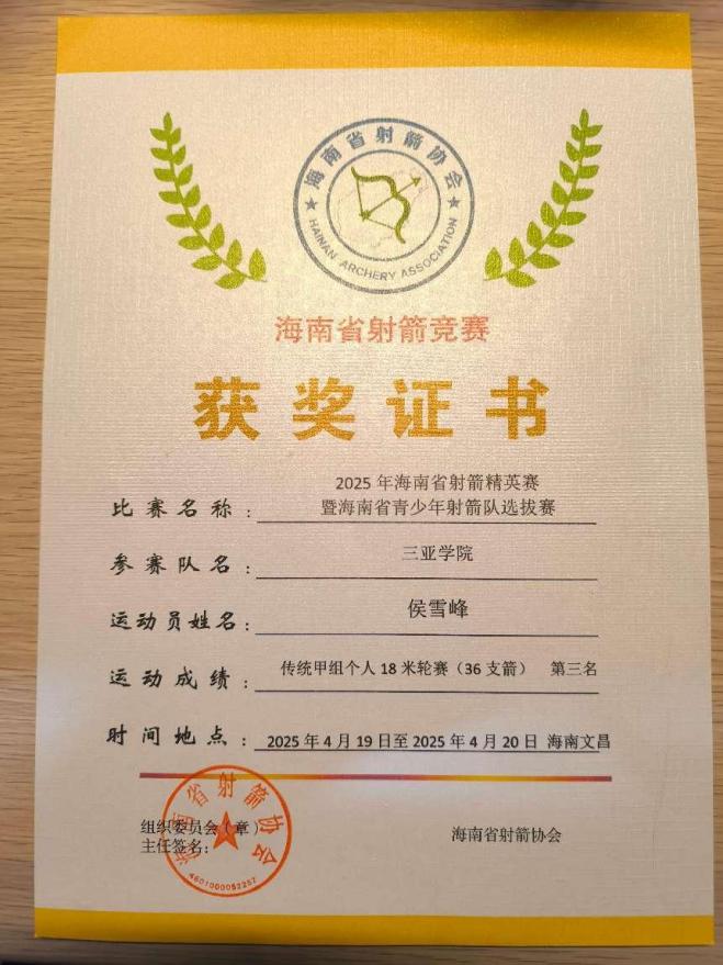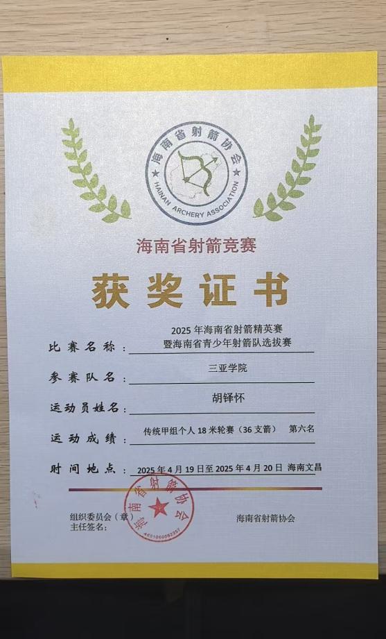 2025年4月19日,由海南省射箭协会主办的“2025海南省射箭精英赛暨海南省青少年射箭队选拔赛”在文昌市圆满落幕。我校射箭队在张啸雷教练的带领下,凭借出色的竞技状态和顽强的拼搏精神,在全省射箭精英中脱颖而出,斩获多项佳绩,为学校赢得了荣誉。