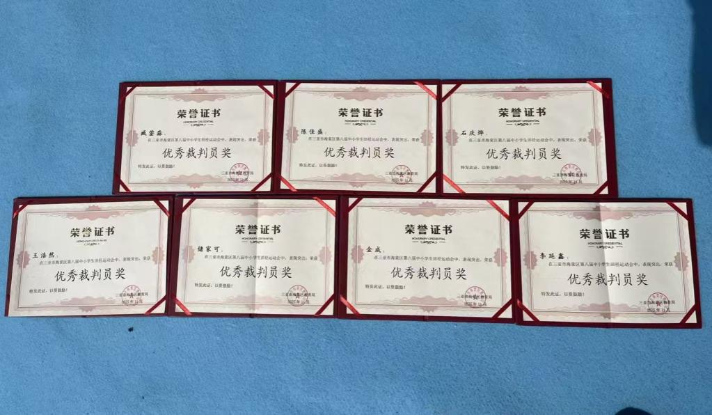 比赛期间,三亚学院的学子们身着统一的裁判服,忙碌在短跑、跳远、跳高、接力赛等多个项目的赛场上。他们严格遵循赛事规则,秉持公平、公正、公开的原则,精准地完成计时、测距、记录等各项工作,动作规范、判罚严谨,展现出扎实的专业功底和良好的职业素养,赢得了赛事组委会、参赛师生及家长的一致好评。七名学生荣获三亚市海堂区教育局授予“优秀裁判”称号。