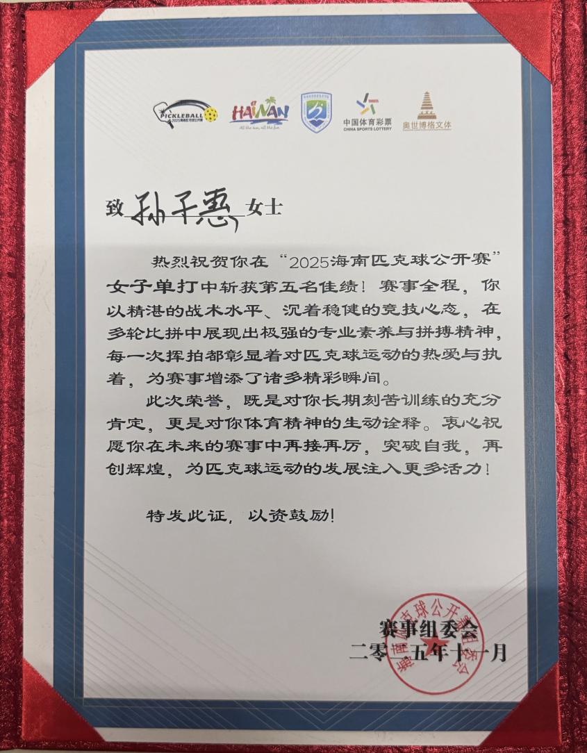 为深化专业建设,创新人才培养模式,积极推动“以赛促学”,将实践课堂延伸至竞技赛场。2025112223,在儋州市举办的海南省匹克球公开赛中,我院休闲体育(康体与抗衰老)专业方向的学子,获女子单打第五名的成绩。此次参赛学校匹克球课程建设的初步成果,也是一次技能的较量,更是我对接大健康产业、培养高素质应用型人才的一次生动实践。