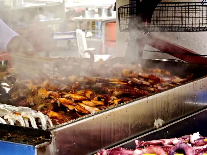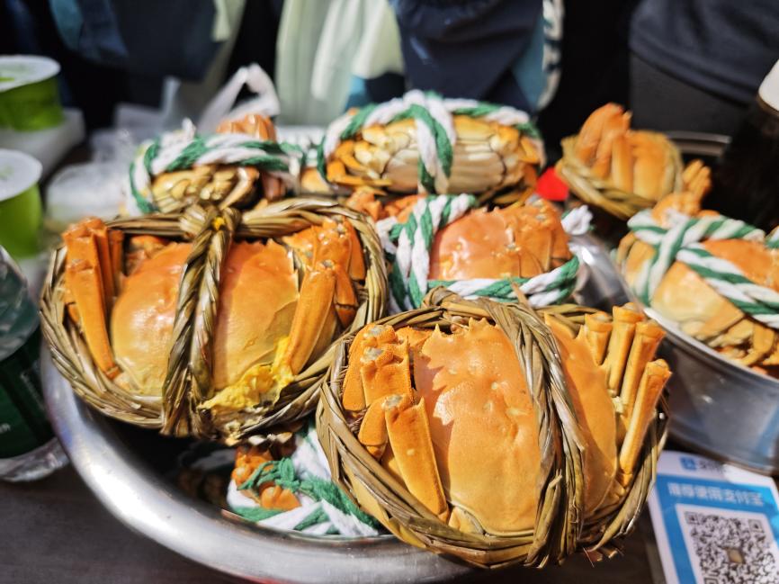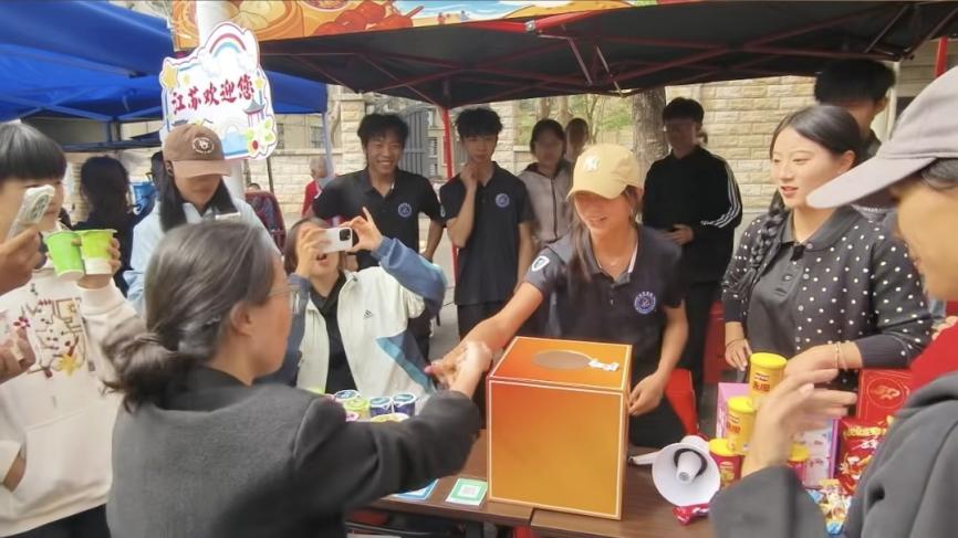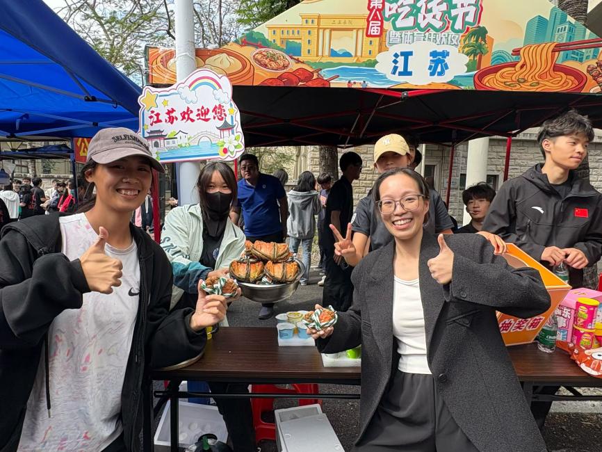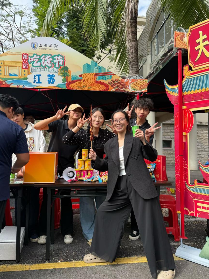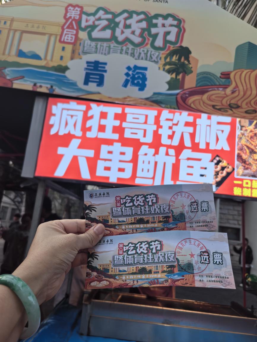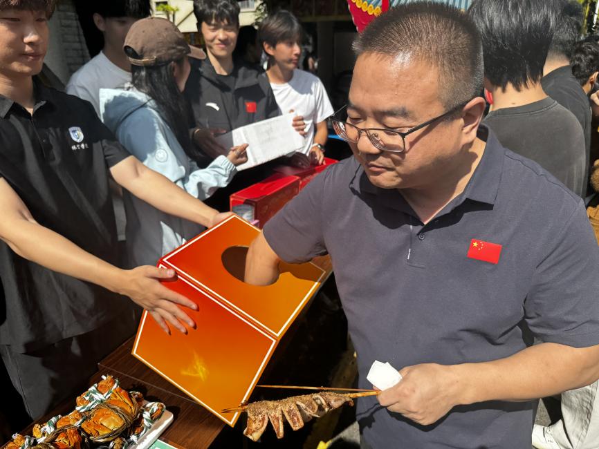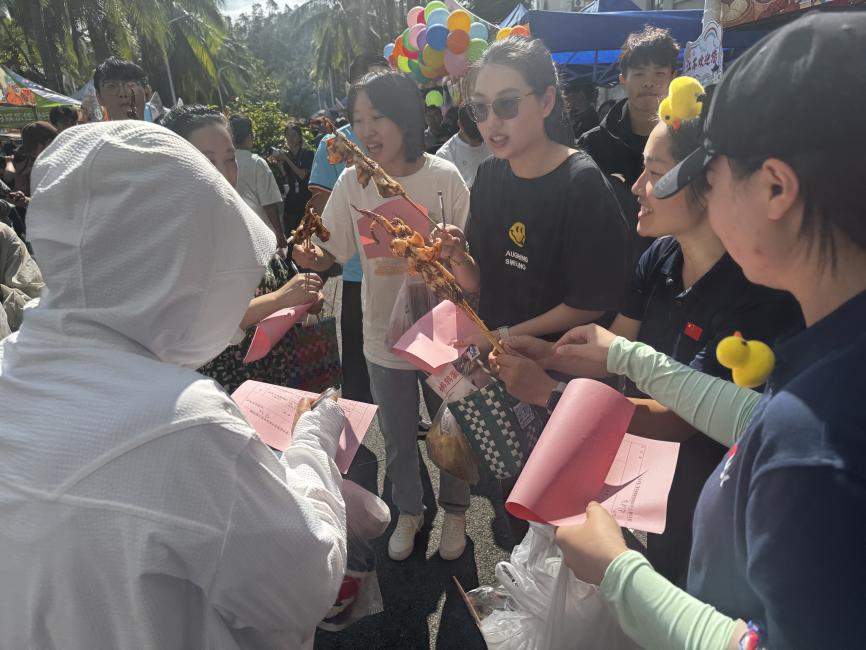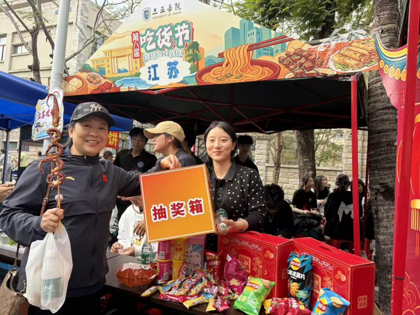 三亚学院体育学院负责的江苏与青海展区同样备受青睐。展区不仅呈现了两地的标志性风味,如大闸蟹等传统地方美食,还增设了铁板鱿鱼等广受欢迎的特色小吃。此外,现场还设置了趣味打卡活动,师生可通过参与猜拳挑战、幸运抽奖等互动游戏,赢取特色美食,进一步点燃了全场的参与热情。