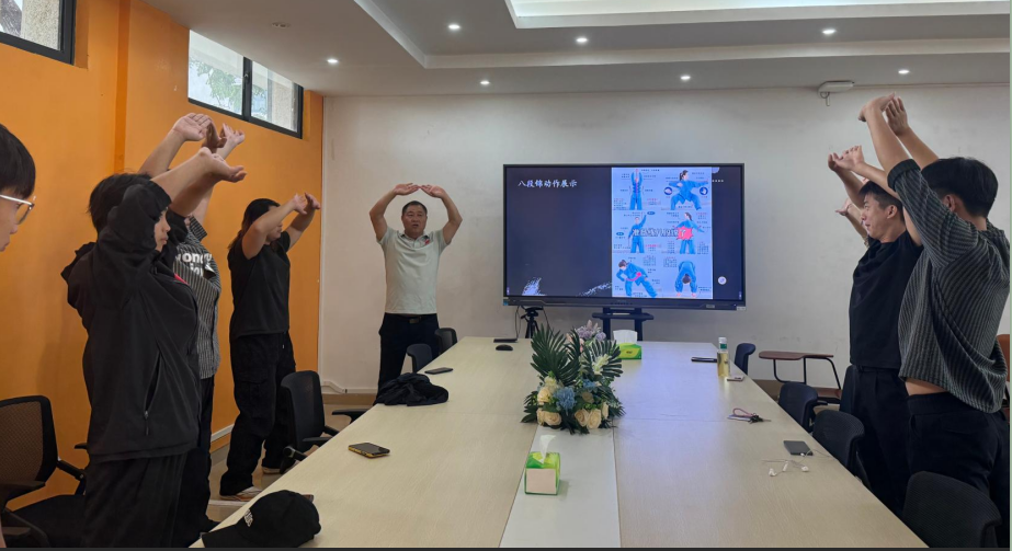 在讲解八段锦的动作特点时,郝教授重点阐述了其“柔和缓慢、圆活连贯、松紧结合、动静相兼”的四大特征。他通过现场示范与视频辅助,详细说明了每个动作的呼吸配合、关节活动与肌肉发力方式,并引用了多项现代研究成果,如上海社区调研显示“双手托天理三焦”可提升肩颈灵活度37%,北京体育大学研究证实“调理脾胃须单举”可降低心率12-15次/分钟,科学印证了八段锦的健身效果。