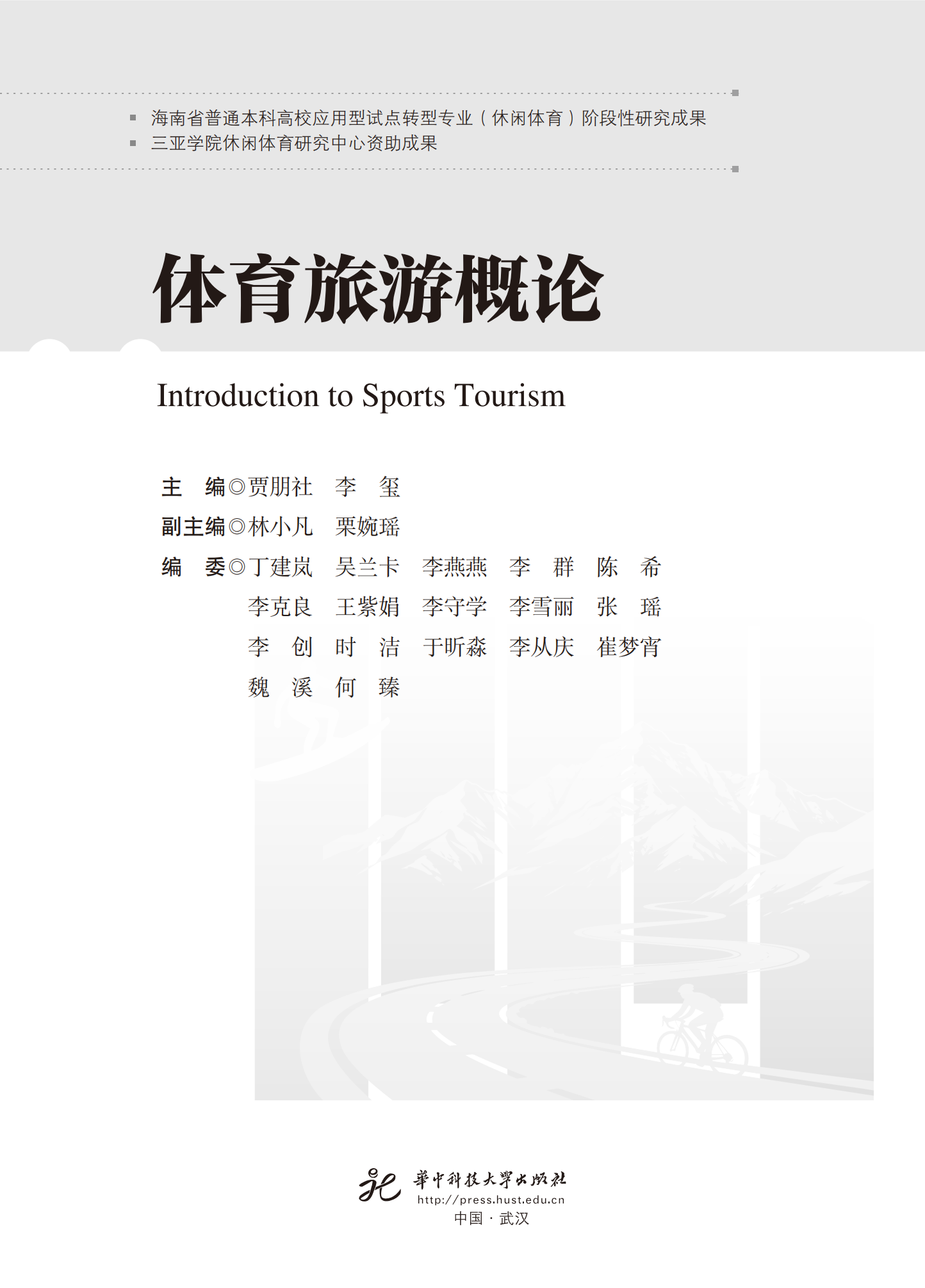 近日,由三亚学院休闲体育研究中心资助,中心主任贾朋社副教授、博士与澳门城市大学博士生导师李玺教授担任主编的,由教育部旅游管理教学指导委员会副主任马勇教授作序,联合多所高校专家学者编撰的《体育旅游概论》正式由华中科技大学出版社出版。《体育旅游概论》教材紧扣当前体育旅游产业发展脉搏与人才培养强烈需求,填补国内相关教材交叉融合体系构建及前沿内容覆盖短板,为休闲体育、体育旅游等相关专业教学提供优质资源。
