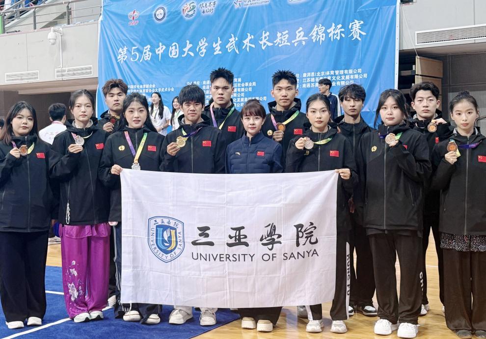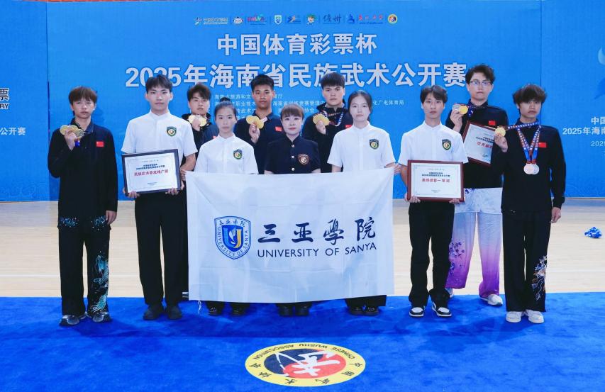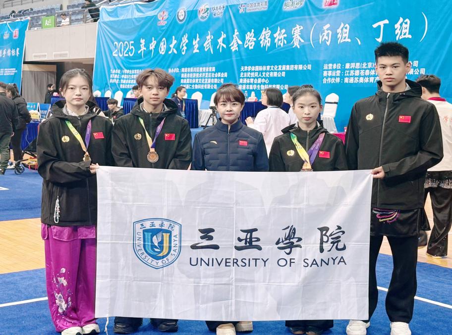 2025年中国大学生武术套路锦标赛(丙组、丁组)三亚学院体育学院代表队获得1金3铜2项第四名2项第五名及1项第八名成绩,三亚学院被授予体育道德风尚奖,我院在此项赛事首次实现金牌零的突破。