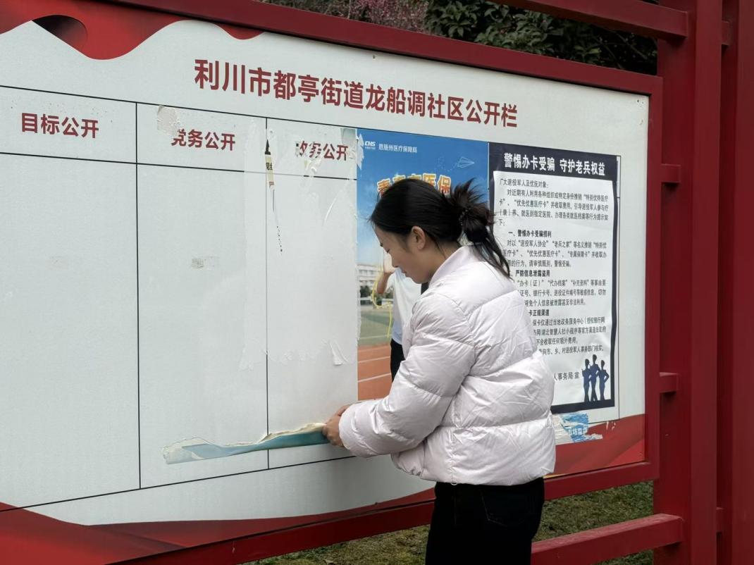 龙船调社区的文化长廊是展示社区风貌、弘扬文明新风的重要窗口,全长近百米。但长期受风吹日晒影响,部分旧展板出现翘角、褪色、破损等问题,既影响社区环境美观,也弱化了宣传引导效果。杨涛慧同志面对粘贴牢固的旧宣传画,耐心清理残余、细致整理版面,有条不紊地完成旧展板清理、新内容张贴、展板布局调整等各项工作,不放过任何一处细节,全力确保新展板张贴平整、美观规范。