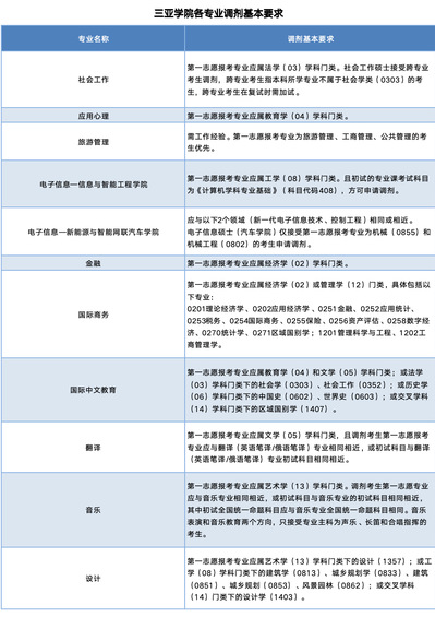 调剂基本要求及调剂程序按照学校公布的《三亚学院2026年硕士研究生招生调剂工作办法》执行。除翻译专业外,我校其他专业仅接受外语语种为英语的考生申请调剂。各专业调剂基本要求如下: